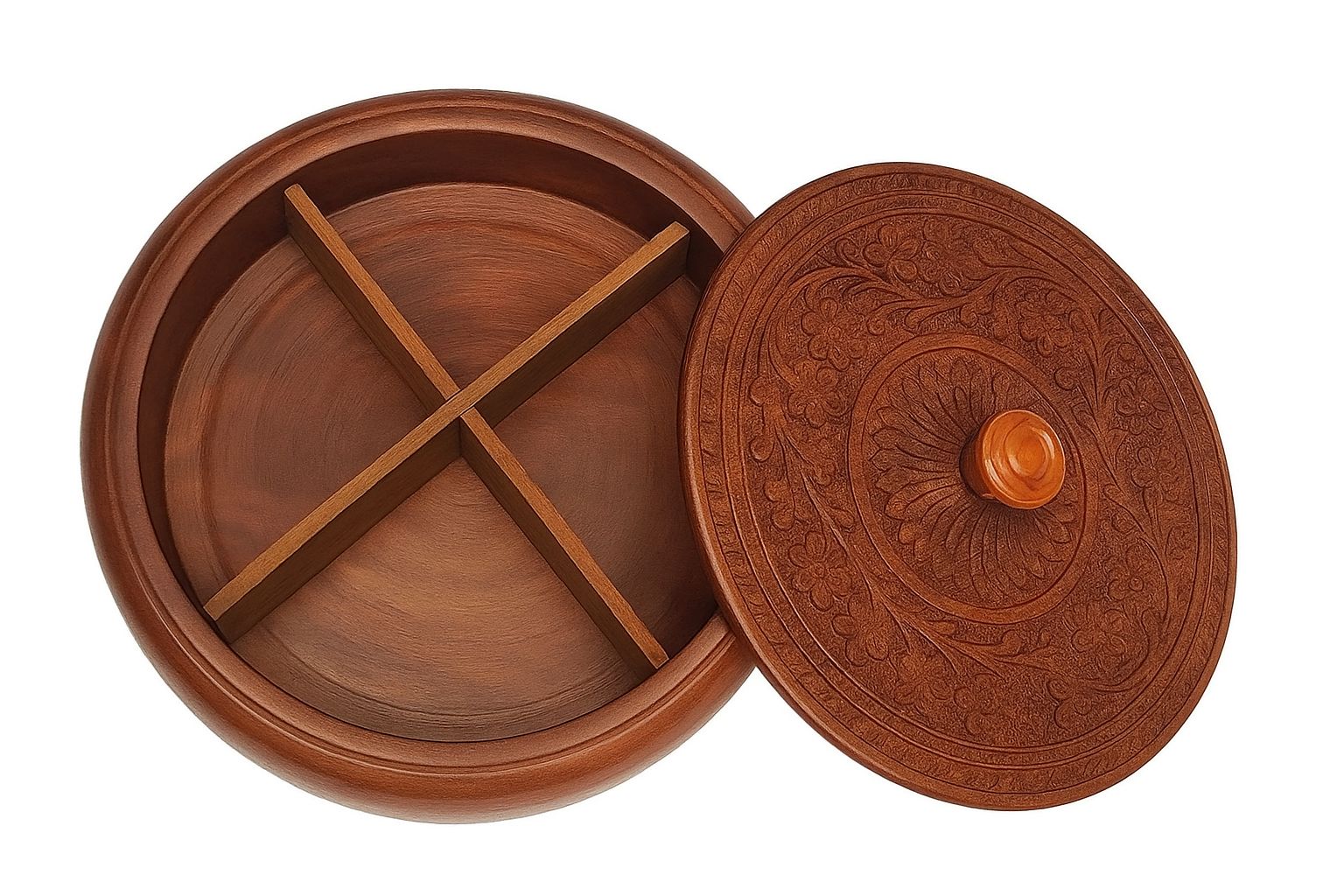 Handcrafted round wooden dry fruit box with floral carving and lid