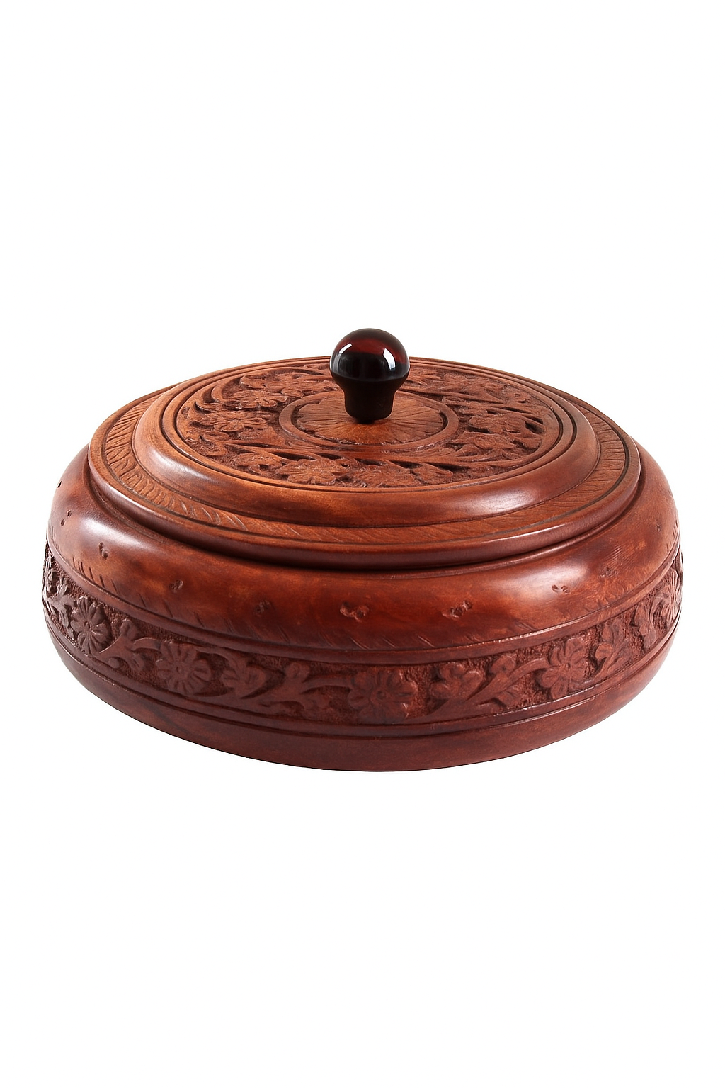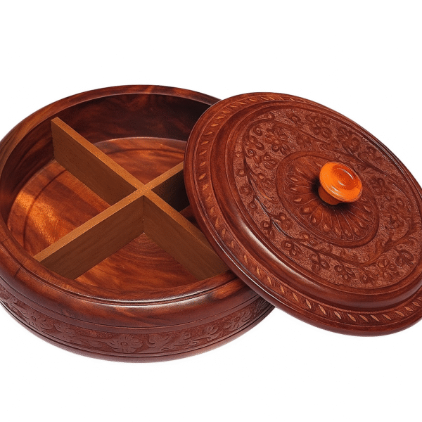 Elevate your home décor and festive gifting with this Handcrafted Wooden Dry Fruit Box with Lid – 4 Compartments, a perfect blend of tradition and utility. Meticulously crafted from premium Sheesham wood, this round dry fruit box features intricate floral hand-carving on the lid and sides, giving it an artisanal touch that stands out.